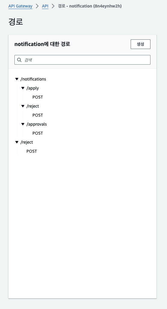 AWS SNS를 통해 메시지를 발행하고 구독자들에게 전송하기 위해서는 Spring Boot 에서 해당 로직을 실행하면서 API Gateway를 호출해야했다. 따라서 triggerUrl로 API Gateway 에 지정해둔 경로로 요청을 보내고 해당 url 에 각각 호출할 람다 함수를 연결해두는 방식으로 구현하였다. 내가 알림을 사용할 기능은 스터디 신청 시 스터디 그룹 장에게 승인 신청이 들어왔다는 알림을 전송 스터디 그룹 장이 승인 했을 시 신청자에게 가입 승인 알림을 전송 스터디 그룹 장이 거절 했을 시 신청자에게 가입 거절 알림을 전송 우선은 이렇게 최소한으로 필요한 부분만 알림 메시지를 발행하기로 계획하였다. 따라서 그에 따른 경로를 다음과 같이 주었다.